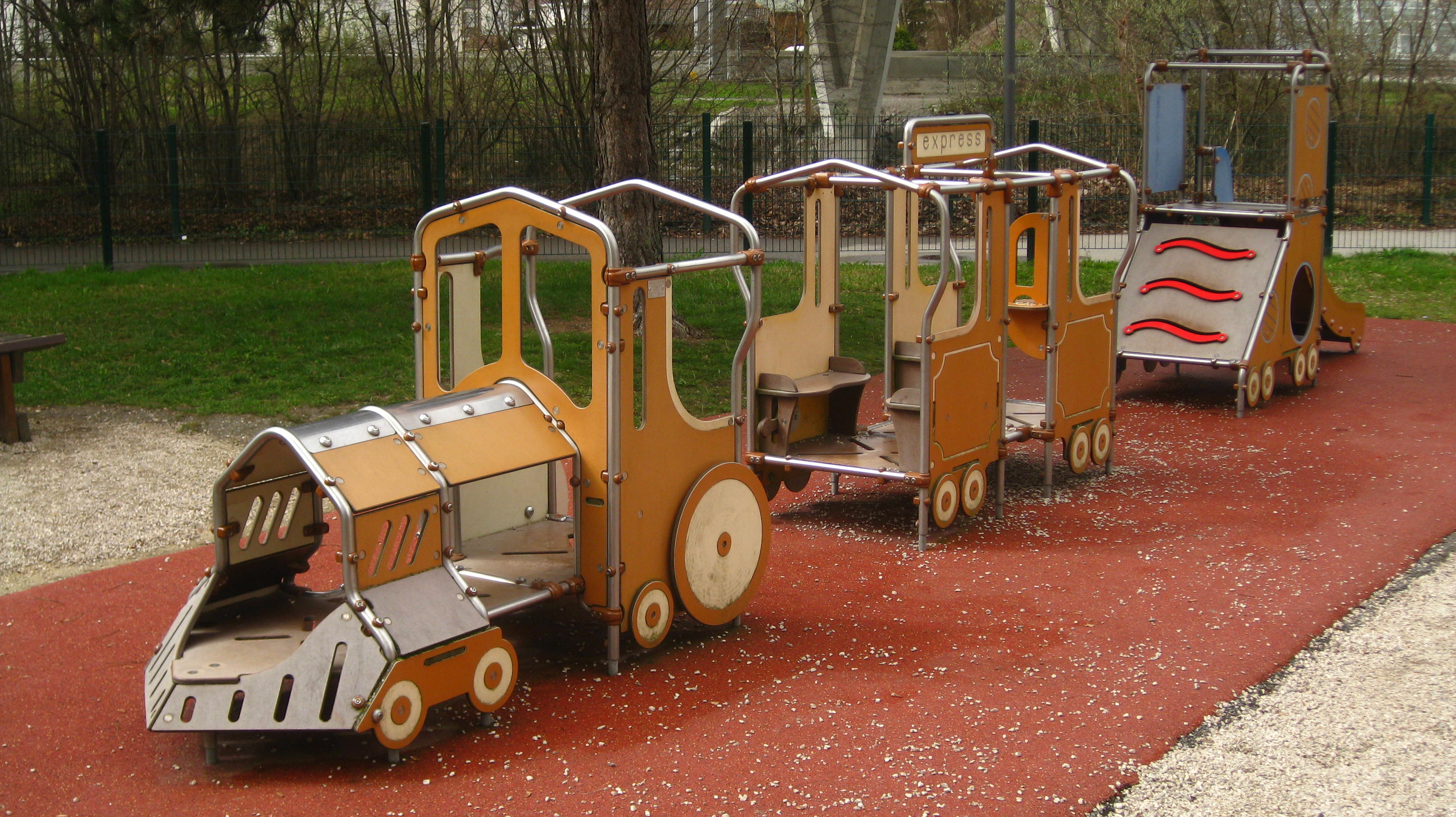 This playground is a firm favourite of ours and it has an excellent location right by 💦 the Arve river, and next to the historic Pont St Martin. The main attraction here is the tall climbing frame with the “tunnel slide”, and there are also swings and other climbing options for older children and a train for little ones. An added bonus is the plentiful FREE parking on-site, and plenty of space by the river to ride a bike or draisienne!