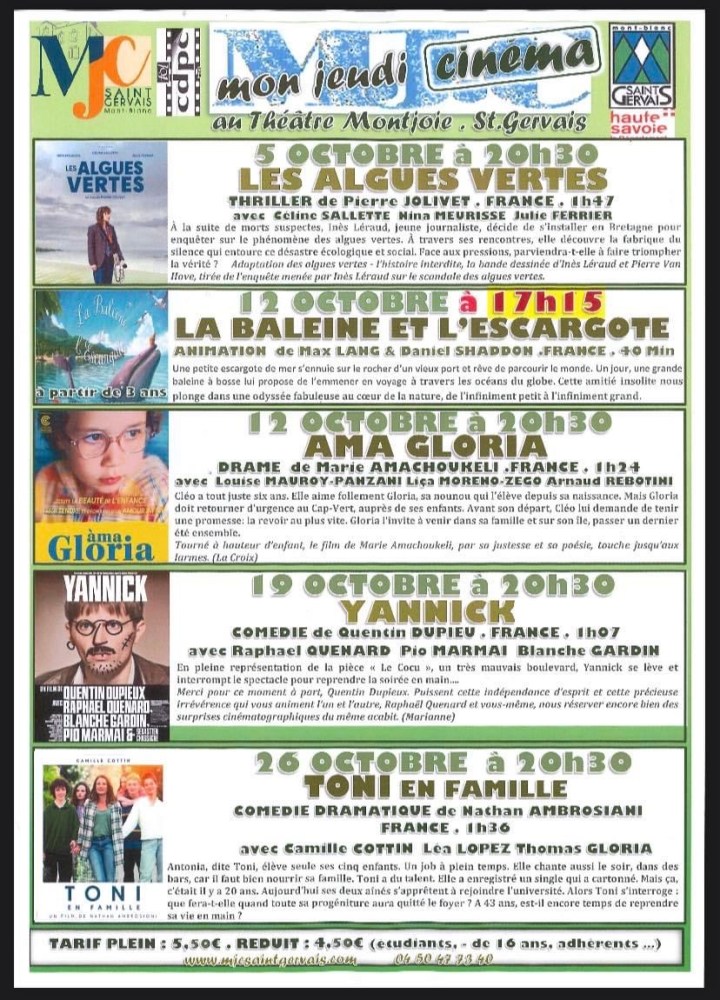 - 🎬 Cinécimes – parents out for a night of cinematic culture might be interested in the evenings of Cinécimes at the Ciné Mont-Blanc; these are screenings of world films and they are organised by the Université Populaire de Sallanches Passy;