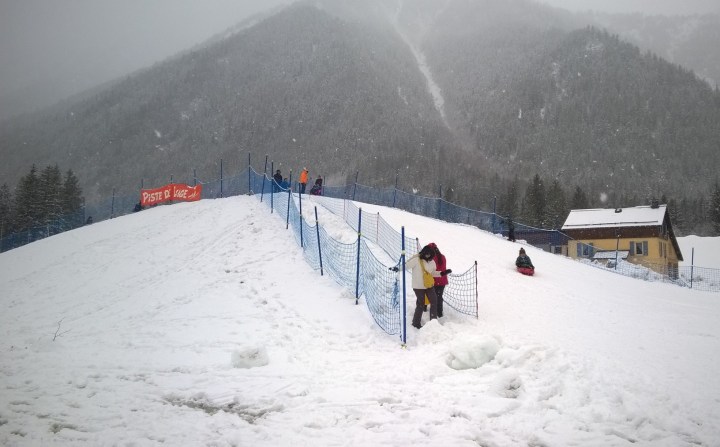 A few years ago, when it was raining 🗻 au Pays du Mont-Blanc, but ❄️ snowing big fluffy snowflakes on the other side of the Mont-Blanc tunnel in 🇮🇹 Italy, we decided to head to Val Ferret with our 🛷 luges, but the road was blocked !