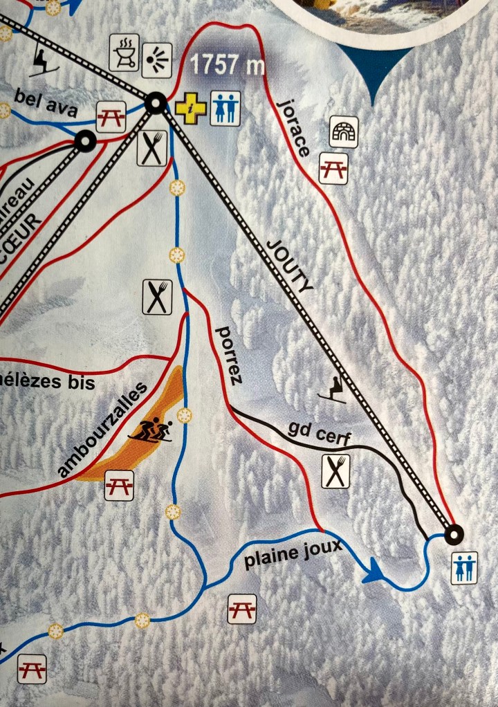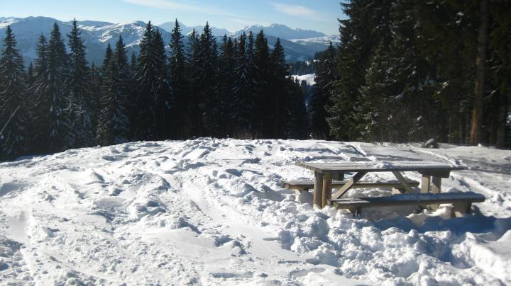 There are some 🍏 great picnic tables, ready for sunshine, throughout the ski station . . . for example, on the La Croix blue piste, heading down from the Télésiège Pertuis (at blue markers 17, 15 and 10)!