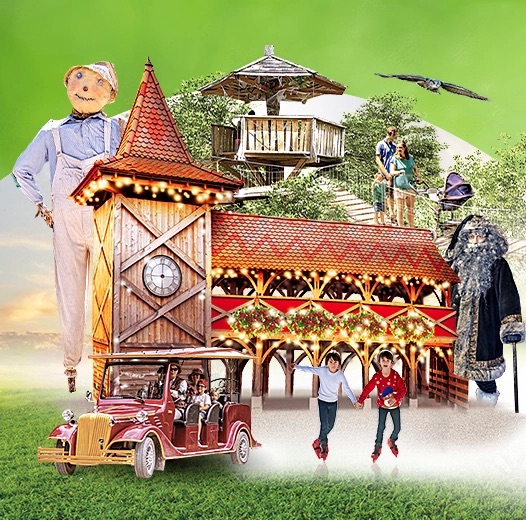 Père Noël, Mr Père Fouettard, Mr Père Gourmand and Casse-Noisette – ” Décors magiques, lumières scintillantes, ambiance chocolat et vin chaud, patinoire, labyrinthe dans les arbres. “.
