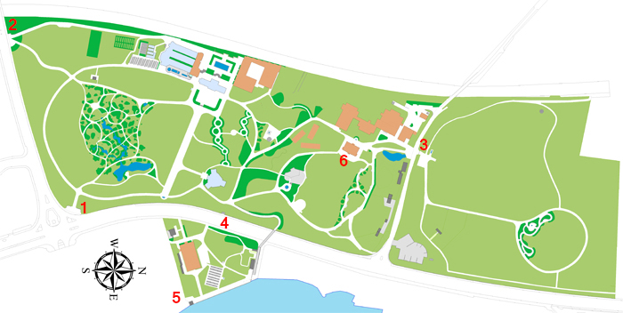 1 playground & restaurant / 2 animal park / 3 the garden of “smell & touch” / 4 picnic area / 5 the carrousel (seasonal);