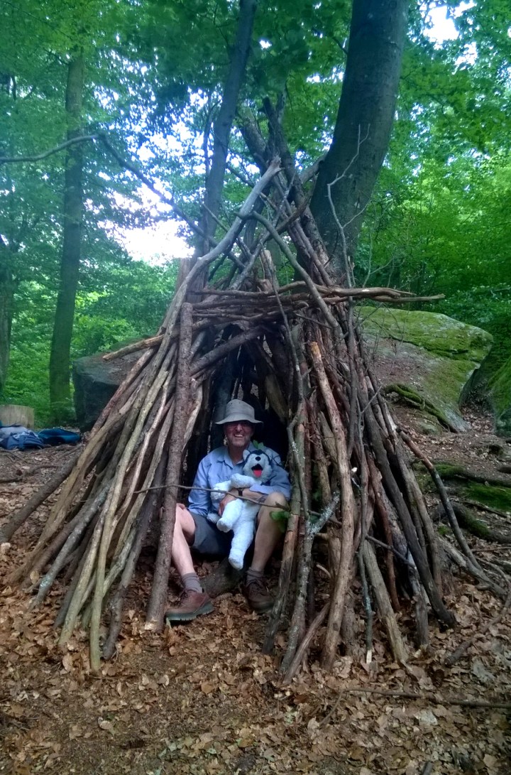 On one ☀️ summer visit, to escape the heat, we found our cabane was still extant, but it was looking a bit worse for wear and needed a little renovation, so we added some solid branches and bits of wood . . . and then poor Grandpa was imprisoned (thankfully with a doudou for company!)