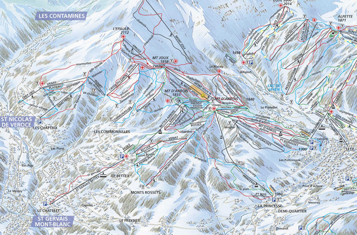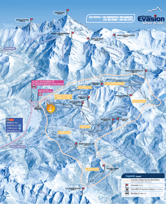 - ⛷ Evasion Mont-Blanc – Saint-Gervais Mont-Blanc domaine skiable is also part of this extensive skiing area (445km of 219 pistes in six ski stations au Pays du Mont-Blanc), allowing you to ski in: Megève, Saint-Nicolas de Véroce, Combloux, La Giettaz, and Les Contamines-Montjoie), though it is only connected directly to Saint-Nicolas de Véroce and Mont d’Arbois;