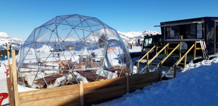 - Cerf Blanc igloo – is a food hut on the Saint-Gervais ski pistes, at the top of the Télésiège Croix, with a cosy transparent igloo to keep you warm on-site! / food served: burgers and more, Marmotte beer;