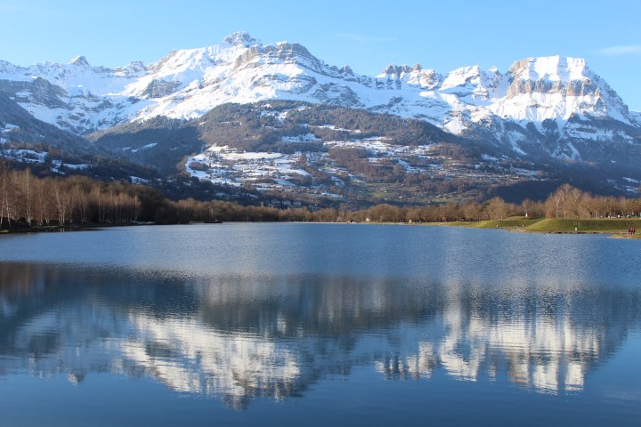 🍁 Autumn leaves quickly make way for bare trees, but the view of 🗻 a snowy Mont-Blanc reflected in the water remains! If it becomes really cold, then the lake may partially or entirely freeze over, and this is MAGICAL! (note – even if the ice looks solid, you are not allowed to stroll out into the middle of the lake, for safety reasons, as the ice may crack! What you can do instead, is find little shards of ice or pebbles and throw them out onto the frozen lake!)
