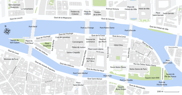 🗺 map of Paris – the 💦 Seine river runs through the oldest part of Paris, and divides it into two parts, known as the Left Bank (rive gauche) and the Right Bank (rive droite);