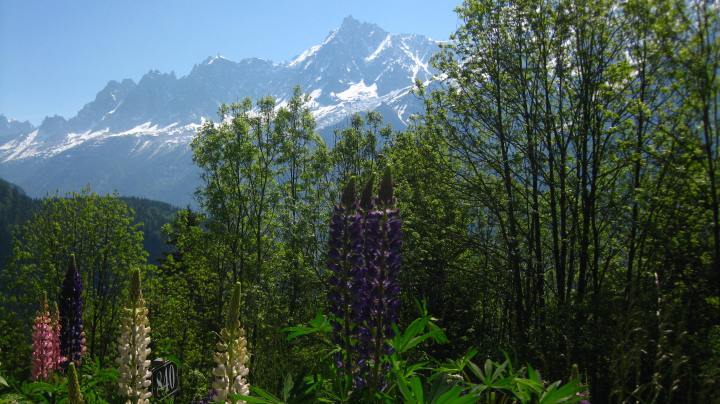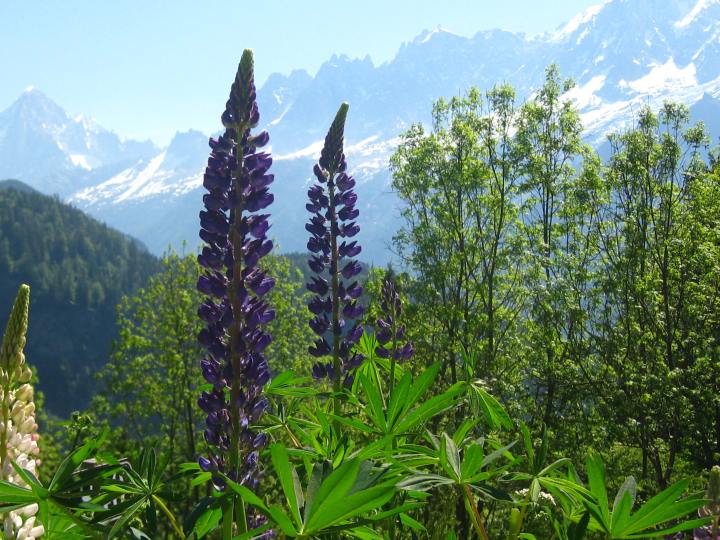 The main highlight of this walk is arriving at the postcard perfect meadow – 🌼 the Alpage de Charousse (1200m)- when the blue, pink and purple lupins are in bloom (May and June time), next to 🏚 the five rustic farmhouses (18th century), beautifully restored in keeping with the traditional style. These farmhouses show off the local rural architecture: a base of solid stone (so that the mice couldn’t reach the grain), and above this, wood – browned by the elements over the years – and shingle (ancelle) roofs. This alpage was an intermediary station, before taking 🐑 the troupeaux (herds) up to higher pastures. It is also 🌿 a glacial field, with a few erratic granite blocks lying about, and you’ll have a 🏔 magnificent view of the Aiguilles de Chamonix and the Chaîne des Fiz!