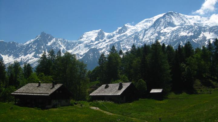 From the 🌼 alpage, you then head up to 🏚 the Grange des Chavants (1280m), and from here you’ll have super views of 🏔 Mont-Blanc.
