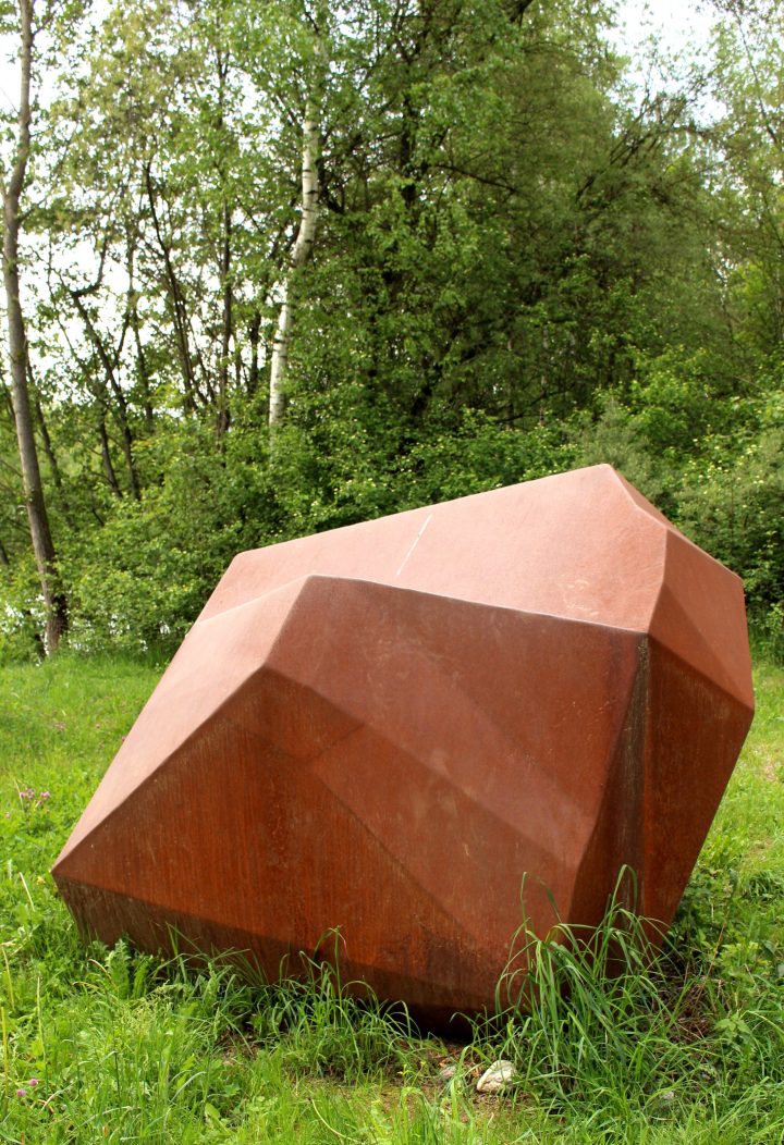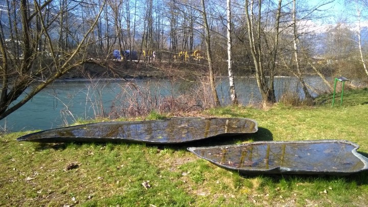 Basserode’s steel stone, le rocher sonore, is the first creation you’ll happen across: « Camouflaged on the banks of the Arve, Basserode’s Corten steel rock sings in the passing water. This sonic fossil intones, for walkers, the murmur of timeless nature. A fruit of the industrial revolution, the Corten steel is a material specifically created to help buildings resist atmospheric conditions. Rusty in essence, Basserode’s work is at once the ruin and the celebration of this science. While water cannot oscidse it any firther, the rock is complicit in its moods. Did it tumble down from the ice heights with the tumulmtuous waters of the Ave? Or is it a reminder of a time when the river ran faster and wider in this valley? ». Stop and listen – do you hear the rock murmering?