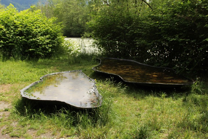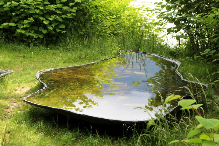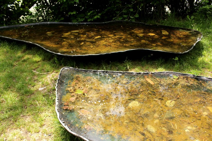 Fabien Lerat’s Flaques are so peaceful, with the 💦 water sometimes reflecting 🍃 🍂 leaves or 🏔 mountains, sometimes still, sometimes moving. The rain water fills the cast iron basins, reforms, becomes a mirror, sometimes overflows . . . « . . . a puddle of water reflects the peaks. On one side the current, the speed, on the other calm water, a still image, that never stops infiltrating and digging its hole in the earth, to be totally absorbed. The whitewater measures the time, the calm water reflets space ».