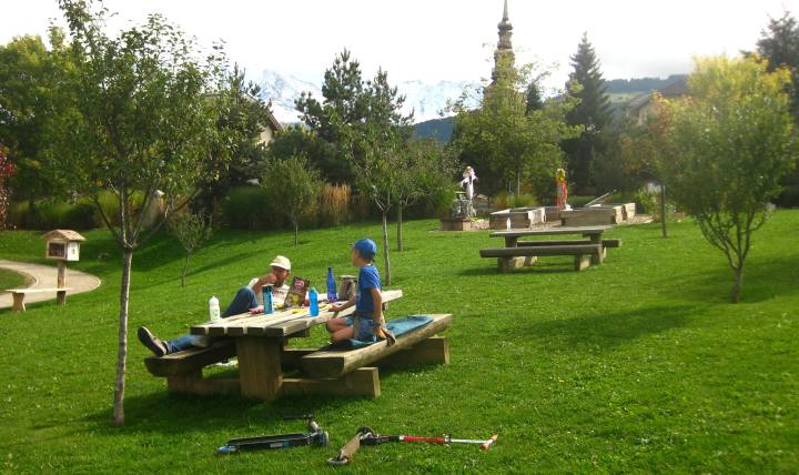 The 🌲 Bois du Bouchet hosts the parapente landing field, and it is a great place to walk, run or cycle with small children, with designated paths, 🚵♀️ cycle routes (and bike park), 🍏picnic tables and plenty of shade. There is an easy hiking & strolling route through the woods, up to Les Praz and back via the river path, accessible in both winter and summer; this is an ideal baby-carrier or buggy walk (with decent wheels), depending on the weather. There is ♿ handicapped access on landscaped paths, with explanatory panels along the way detailing mountain terrain, flora and fauna. There is also the parcours orientation in the woods (be sure to print out the relevant maps before hand). You can stop for ☕️ snacks at the La Crèmerie or Le Robinson in the woods.