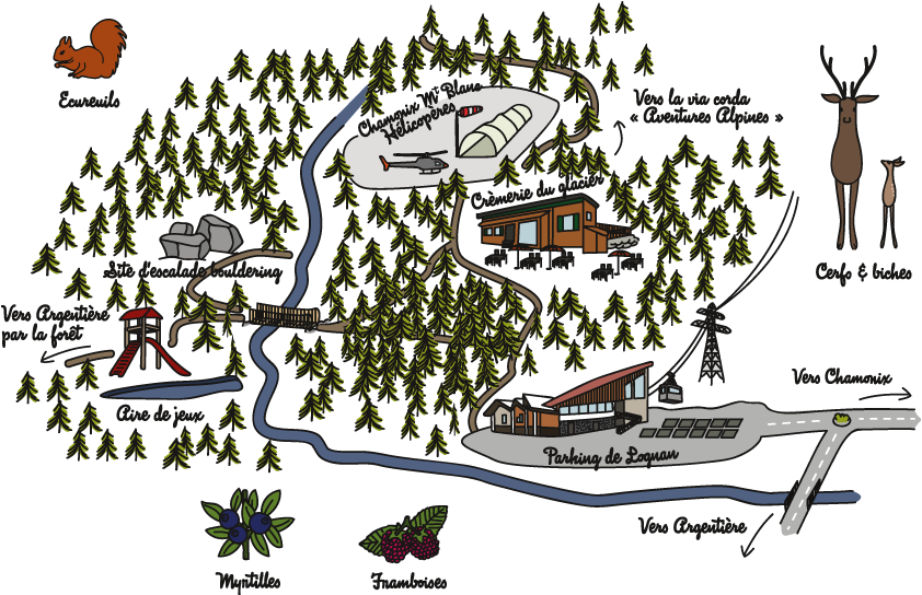The easiest access to the 🥤 La Crèmerie du Glacier is up the 4×4 road that leads to 🚁 the Hélicoptères de Chamonix from 🅿️ the Grands Montets car park, but there are also lots of lovely walks that you can do in 🌳 the nearby forest. You are also near the 🐸 mare aux têtards & 🌈 playground in the woods and there is a fabulous parcours orientation to do nearby.