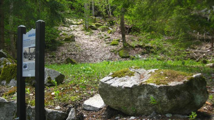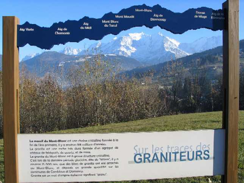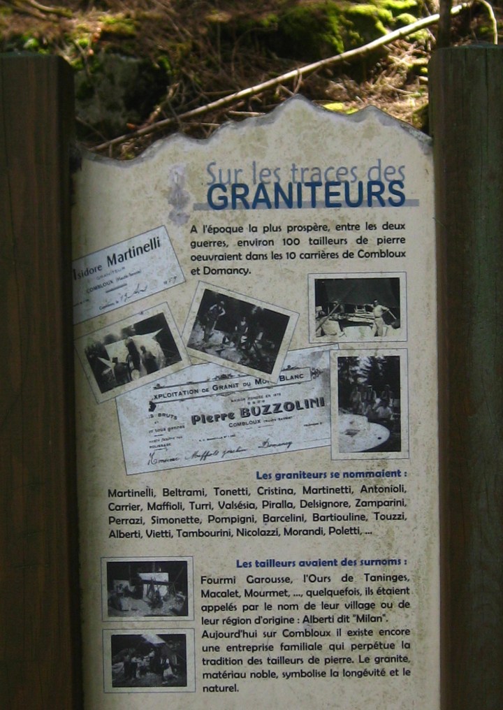 So what exactly is the themed walk ⚒ « Sur les traces des Graniteurs » ? It is a short hike with explanatory panels, which explains a rich time in the history of Combloux village and its patrimoine and savoir faire: ⚒ granite exploitation and cutting!