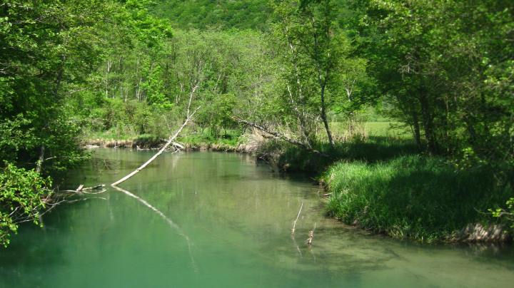 Then you emerge into 🌿 an open field, before joining the annotated boucle, which takes you through the wetland, and past 💦 the rivers to 🐟 the lake.