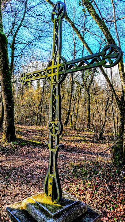 Your walk through the 🏞 nature reserve begins in amongst 🌳 the trees, on a wide and gravelled path. You’ll pass a metal cross – a reminder of the very ⛪ first church that stood in Doussard: