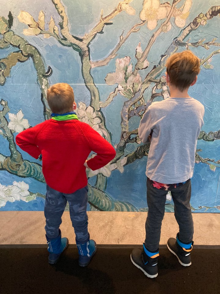 I think the best way to experience this part of the visit is to sit and just absorb. You can sit for as long as you like – Van Gogh’s paintings and drawings come alive around you. It doesn’t matter where you sit, from any angle you can experience the light, colour, movement and music – it is so sensory! Here you can see my boys looking pretty comfortable (though one is such a wriggly worm!).