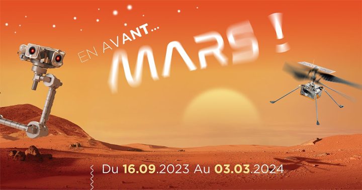 - « En avant : MARS » (7+ years) – until March 2024 / ” Un étonnant voyage imaginaire vers 𝗠𝗮𝗿𝘀, dans une scénographie immersive où manipulations et jeux ont leur place. La planète Mars est l’une de nos plus proches voisines dans le système solaire. Et pourtant nous la connaissons encore très mal, alors que c’est la planète la plus explorée à ce jour. Quelques sondes en orbite et robots roulants à sa surface nous en donnent une vision partielle mais surprenante. Partant d’un jardin bien terrestre nous rappelant que Mars est visible dans le ciel nocturne, le visiteur voyage aussi dans le temps à travers l’histoire des observations depuis la Terre et en orbite autour de Mars. Dans le centre d’analyse se dévoile l’histoire surprenante et tourmentée de cette planète ‘’pas si rouge que ça’’, car après un passé durant lequel volcanisme intense et eau liquide ont modelé les paysages, Mars a perdu son atmosphère, se transformant petit à petit en un monde gelé aux reliefs vertigineux. L’exposition se poursuit au cœur de panoramas obtenus grâce aux quelques robots posés sur le sol martien. Il sera l’occasion de présenter les connaissances actuelles que nous avons de cette planète-désert qui parait figée et inhospitalière et de comprendre comment les scientifiques étudient Mars, imaginant un jour y envoyer des explorateurs. Conçue et réalisée par le Pavillon des sciences de Montbéliard ” / ⇒ reservations;