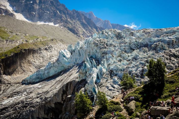 Just above the buvette is a 📷 photo exhibition, recounting the life and history of the ❄️ Glacier des Bossons, that commences at the chalet and guides you a short distance up to a panoramic viewing platform of the glacier. Each panel along the path presents a particular story about the glacier: you’ll learn about the mini ice-age and the ice grotto that was carved into the glacier for tourists back in the 19th century, and plenty of other fascinating facts. And you will learn about the air crashes on Mont-Blanc decades ago (there are even parts of the 1960 Air India Malabar Princesse aeroplane which crashed into an arête of Mont Blanc – these aeroplane parts have been retrieved from the glacier over the years!).