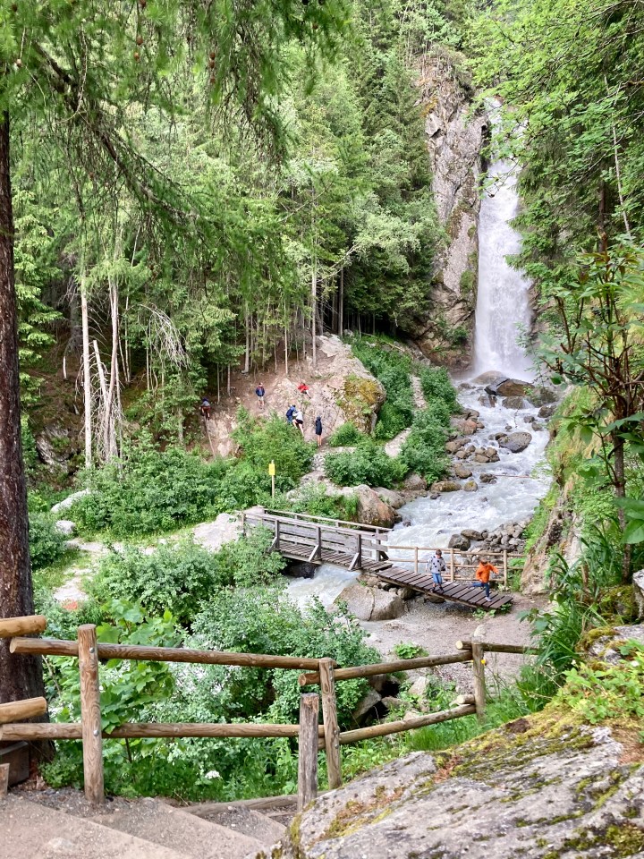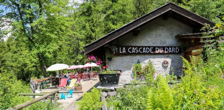 You get 💦 a local waterfall AND a buvette on this short hike from the centre of town! A winding path through 🌲 the forest will bring you 200m up to this buvette, with views of the ⛰ Aiguilles Rouges across the valley . . .